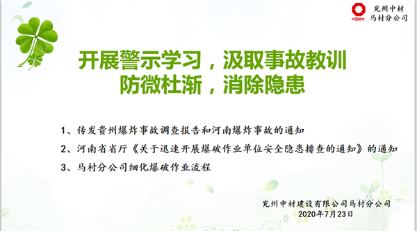 馬村分公司于7月23日下午在會(huì)議室舉行了“開展警示學(xué)習(xí),汲取事故教訓(xùn),牢筑安全防線”的會(huì)議,會(huì)議為大家轉(zhuǎn)發(fā)了《貴州凱里市舟溪鎮(zhèn)“3.19”較大爆炸事故調(diào)查報(bào)告》及河南欒川縣爆炸事故有關(guān)情況、河南省省廳《關(guān)于迅速開展爆破作業(yè)單位安全隱患排查的通知》。同時(shí)為了認(rèn)真貫徹“安全第一、預(yù)防為主”的方針,切實(shí)做好現(xiàn)場(chǎng)安全爆破作業(yè),并規(guī)范管理使用民用爆炸物品的工作,從根本上消除爆破安全隱患,杜絕爆破事故的發(fā)生,實(shí)現(xiàn)安全生產(chǎn),馬村分公司參會(huì)人員學(xué)習(xí)爆破作業(yè)安全規(guī)程的相關(guān)知識(shí)。 學(xué)習(xí)完調(diào)查事故報(bào)告及相關(guān)通知后,分公司涉爆人員紛紛根據(jù)自身工作情況結(jié)合學(xué)習(xí)內(nèi)容積極展開自查自糾活動(dòng),其中結(jié)合分公司公司實(shí)際,管理人員提出以下問(wèn)題: 分公司執(zhí)行經(jīng)理劉黨提出:一是現(xiàn)場(chǎng)涉爆人員在卸載炸藥時(shí),要輕拿輕放,避免炸藥和地面石塊等發(fā)生碰撞,產(chǎn)生火花發(fā)生殉爆;二是在制作起爆器材時(shí),用木棍先在乳化炸藥包裝上扎眼,再插入電子雷管,禁止用金屬物件,以免發(fā)生安全隱患。 經(jīng)理助理曲光澤提出:一是在民爆物品審批時(shí),一定要按照打孔孔數(shù)申報(bào),提前規(guī)劃、計(jì)算好需要的數(shù)量,防止數(shù)量過(guò)多,以免后續(xù)存在安全隱患;二是有爆破作業(yè)時(shí),一定按照河南省公安下發(fā)的通知,爆破工程技術(shù)人員、爆破員(2人)、安全員及保管員(2人)及時(shí)到位,履行各自的職責(zé),并及時(shí)拍照上傳給公安機(jī)關(guān)。 安全員王建平提出:爆破現(xiàn)場(chǎng)要及時(shí)做好安全警戒,用警戒繩劃出爆破范圍;并且爆破作業(yè)區(qū)域內(nèi)禁止吸煙、攜帶打火機(jī),并要求現(xiàn)場(chǎng)人員相互監(jiān)督,及時(shí)制止不安全行為,消除一切安全隱患。 最后由項(xiàng)目經(jīng)理李文軍做最后總結(jié),先是通過(guò)對(duì)貴州凱里市舟溪鎮(zhèn)“3.19”較大爆炸事故調(diào)查報(bào)告的學(xué)習(xí),大家要學(xué)習(xí)“四不放過(guò)”原則,深刻汲取事故教訓(xùn),防微杜漸,消除隱患。并且著重強(qiáng)調(diào)安全無(wú)小事,尤其是涉及到爆破作業(yè),更要小心謹(jǐn)慎,時(shí)刻謹(jǐn)記“四不傷害”原則,保證自己的安全也要保證他人的安全。更要注意細(xì)節(jié),從民爆物品的審批開始,必須有申請(qǐng)單,根據(jù)炮孔總米數(shù)計(jì)算藥量,爆破工程技術(shù)人員審批后,才可以進(jìn)行民爆信息平臺(tái)的申請(qǐng),后續(xù)的領(lǐng)用、發(fā)放,裝卸,裝藥、填塞,警戒,起爆,爆后檢查等一系列流程,都要保持著細(xì)心、小心、耐心的態(tài)度進(jìn)行各自的工作。同時(shí)要求分公司涉爆人員根據(jù)自己的崗位,細(xì)化流程,盡早擬定一份爆破作業(yè)流程,供分公司人員學(xué)習(xí)。