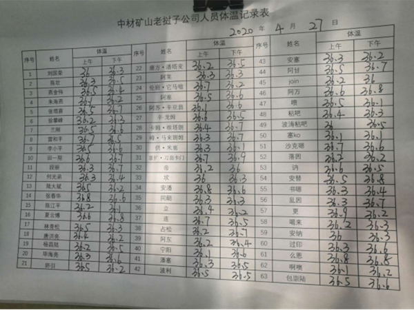 根據(jù)老撾衛(wèi)生部2020年4月28日下午2點(diǎn)半的數(shù)據(jù)更新,老撾已經(jīng)連續(xù)16日未出現(xiàn)新的新冠病例,從1月份到4月28日,累計(jì)檢測(cè)1815例,累計(jì)排除1796例,累計(jì)確診19例,累計(jì)治愈出院7例,現(xiàn)存12例,11例在萬(wàn)象150友誼醫(yī)院,1例在瑯勃拉邦省醫(yī)院,均為輕微癥狀。 隨著新型冠狀肺炎在全球蔓延,疫情防控形勢(shì)異常嚴(yán)峻,老撾項(xiàng)目部按照公司統(tǒng)一部署,加強(qiáng)領(lǐng)導(dǎo),高度重視,積極應(yīng)對(duì),采取有力措施,確保疫情防控和安全生產(chǎn)工作的順利進(jìn)行。 一、成立疫情期間突發(fā)事件應(yīng)急領(lǐng)導(dǎo)小組,建立健全安全防范工作機(jī)制,明確各小組成員職責(zé)劃分。 按照突發(fā)事件性質(zhì)、機(jī)理和發(fā)生過(guò)程分類為突發(fā)聚集性疫情、醫(yī)療防疫物資采購(gòu)和運(yùn)輸受限、境外項(xiàng)目醫(yī)療防疫物資和生活物資儲(chǔ)備不能滿足需要、醫(yī)療防疫物資和生活物資遭哄搶、中方員工或中外方員工之間發(fā)生群體性事件、項(xiàng)目營(yíng)地遭恐怖襲擊、人員緊急撤離回國(guó)、其他如綁架劫持等八類事件。根據(jù)項(xiàng)目所在地疫情形勢(shì)、社會(huì)治安狀況、物資供應(yīng)情況等外部條件以及突發(fā)事件的性質(zhì)、嚴(yán)重程度、可控性和影響范圍等因素,將項(xiàng)目疫情突發(fā)事件分為I級(jí)(特別重大)、II級(jí)(重大)、III級(jí)(較大)和IV級(jí)(一般)四個(gè)級(jí)別。并根據(jù)上述四個(gè)級(jí)別建立對(duì)應(yīng)四級(jí)響應(yīng)機(jī)制,建立相應(yīng)應(yīng)急預(yù)案并進(jìn)行演練。 二、編制各項(xiàng)應(yīng)急培訓(xùn) 1.項(xiàng)目全員進(jìn)行新冠病毒相關(guān)知識(shí)培訓(xùn),確保每人都能熟悉相關(guān)防疫知識(shí)。 2.防護(hù)措施、防護(hù)要領(lǐng)培訓(xùn),確保每名員工都能做好自身防護(hù),并充分認(rèn)識(shí)到做好自身防護(hù)的重要性。 3.特殊時(shí)期安保、安全意識(shí)再培訓(xùn),鞏固培訓(xùn)。 4.進(jìn)行各項(xiàng)專項(xiàng)應(yīng)急預(yù)案演練工作。   開展培訓(xùn)學(xué)習(xí) 三、采取各項(xiàng)預(yù)防措施 項(xiàng)目部本著“以人為本、預(yù)防為主、防治結(jié)合”的原則,牢固樹立“全員防疫”的思想意識(shí)。通過(guò)各種形式和途徑來(lái)宣傳疫情影響下可能帶來(lái)的突發(fā)事件及應(yīng)對(duì)措施。 1.疫情預(yù)防 1.1實(shí)時(shí)掌控老撾和項(xiàng)目所在地的疫情增長(zhǎng)情況,評(píng)估疫情風(fēng)險(xiǎn)。 1.2 疫情初期密切關(guān)注當(dāng)?shù)厣鐣?huì)疫情發(fā)展對(duì)物資供應(yīng)所產(chǎn)生的影響,不等不靠,主動(dòng)作為,利用各類資源多途徑多渠道籌措物資及時(shí)儲(chǔ)存足夠防疫、生活物資。 1.3 優(yōu)化各生產(chǎn)工種人員,精簡(jiǎn)部分當(dāng)?shù)貑T工、精簡(jiǎn)一些非必要崗位且傳播風(fēng)險(xiǎn)高的當(dāng)?shù)貑T工,如食堂幫工、項(xiàng)目駐地清潔工等。 1.4 優(yōu)化現(xiàn)場(chǎng)生產(chǎn)工作流程,減少或避免一些非必要的中方員工與當(dāng)?shù)貑T工接觸交流情況。 1.5 給當(dāng)?shù)貑T工配備口罩、護(hù)目鏡、手套等防護(hù)用品,上下班體溫監(jiān)測(cè)。 1.6 項(xiàng)目駐地、辦公場(chǎng)所、生產(chǎn)場(chǎng)所、生產(chǎn)生活車輛設(shè)備等每日定時(shí)定點(diǎn)消毒。 1.7 制定項(xiàng)目疫情防控規(guī)定,對(duì)防護(hù)物品佩戴、體溫測(cè)量、距離保持、聚餐等行為進(jìn)行嚴(yán)格規(guī)范和要求。 1.8加強(qiáng)職工食堂、員工宿舍的衛(wèi)生管理,防止交叉感染。 1.9 當(dāng)?shù)夭少?gòu)的生產(chǎn)生活物資嚴(yán)格執(zhí)行開箱前送貨車輛消毒、開箱后貨物消毒、入庫(kù)后再消毒多次全方位消毒措施。   部分雙語(yǔ)宣傳頁(yè)   部分防疫物資  體溫記錄表 2.其他突發(fā)事件預(yù)防 2.1以適當(dāng)?shù)那罍贤üこ膛従用耜P(guān)系。尊重當(dāng)?shù)貑T工,平等相待,和睦共處;人員雇傭時(shí),要兼顧所在地各社區(qū)利益,避免社區(qū)麻煩。項(xiàng)目駐地嚴(yán)格實(shí)行封閉管理制度,非上下班期間,禁止任何人員外出駐地。 2.2建立并保持與工程項(xiàng)目所在地政府機(jī)構(gòu)、治安機(jī)構(gòu)的聯(lián)系渠道。 2.3關(guān)注工程所在地和毗鄰地區(qū)社會(huì)治安動(dòng)向。發(fā)現(xiàn)工地、駐地周邊有可疑情況,及時(shí)采取應(yīng)對(duì)措施并向我國(guó)使(領(lǐng))館和當(dāng)?shù)卣畧?bào)告。 2.4 精簡(jiǎn)當(dāng)?shù)貑T工時(shí),并就工資、勞工補(bǔ)償?shù)冗_(dá)成協(xié)議,避免當(dāng)?shù)貑T工出現(xiàn)群體性事件。 2.5礦山增加夜間照明設(shè)備,安排人員24小時(shí)值班,防止偷盜、搶劫等。 2.6與員工開展談心活動(dòng),穩(wěn)定員工的思想和情緒;項(xiàng)目部領(lǐng)導(dǎo)和安全主管要定期或不定期與當(dāng)?shù)毓蛦T、司機(jī)交流,了解其思想動(dòng)態(tài),一旦發(fā)現(xiàn)有不好的苗頭,應(yīng)立即采取措施。 2.7告誡司機(jī)無(wú)特殊情況上下班中途不準(zhǔn)停車,不準(zhǔn)搭載其他人乘車。要求司機(jī)定期檢查車輛狀況,發(fā)現(xiàn)問題及時(shí)報(bào)告處理,不允許車輛