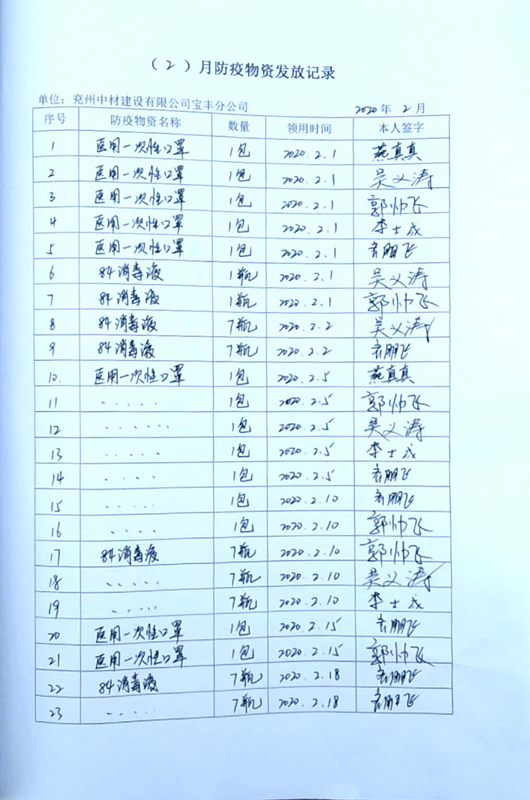 二、建立疫情防控領(lǐng)導(dǎo)小組,確保復(fù)工復(fù)產(chǎn)安全有序 分公司成立疫情防控領(lǐng)導(dǎo)小組,分公司經(jīng)理任組長,組員由已到崗的全體員工組成。領(lǐng)導(dǎo)小組嚴(yán)格按照當(dāng)?shù)卣?,?yán)格落實疫情期間的消殺管控及登記制度,并與當(dāng)?shù)卮逦瘯蠘I(yè)主加強(qiáng)溝通,將感染風(fēng)險降至最低。 三、多途徑購買防疫物資,確保防疫物資供應(yīng) 寶豐分公司復(fù)工復(fù)產(chǎn)前,針對防疫物資緊缺的情況,一方面請求業(yè)主代為購買防疫物資,另一方面請求總公司代為購買。截止2月25日寶豐分公司已購買口罩900個,84消毒液90kg,防護(hù)服8套,護(hù)目鏡8套,酒精5kg,紅外線電子額溫槍1部,水銀體溫計10個;防疫物資準(zhǔn)備充足,滿足1個月用量。  四、嚴(yán)格落實防控措施 (1)開展環(huán)境整治。對辦公場所及生產(chǎn)場所進(jìn)行衛(wèi)生清理;對空調(diào)進(jìn)行清理洗。 (2)滅菌殺毒。每日2次對辦公場所及生產(chǎn)場所進(jìn)行消毒處理,上午7:30至8:00,下午17:30至18:00。