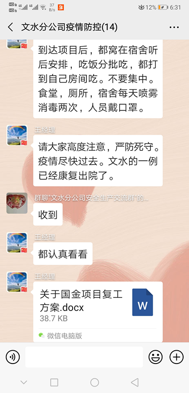 ---------文水分公司防疫防控工作 自新型冠狀病毒疫情爆發(fā)出現(xiàn),公司領(lǐng)導(dǎo)高度重視,為確保項目部能夠順利復(fù)工,以及職工能夠安全度過疫情期,文水分公司做了以下工作: 1、由王建立經(jīng)理統(tǒng)一領(lǐng)導(dǎo),分公司人員負責(zé)成立疫情防控小組,制定復(fù)工方案協(xié)助業(yè)主開展防疫工作。新型冠狀病毒感染的肺炎疫情防控工作的處置由疫情防控工作領(lǐng)導(dǎo)小組統(tǒng)一領(lǐng)導(dǎo),全體人員無條件服從領(lǐng)導(dǎo)小組的指揮調(diào)度。以職工根本利益為出發(fā)點和落腳點,依照法律法規(guī)和政策辦事,防止因處置不當(dāng)而造成疫情蔓延事件發(fā)生。