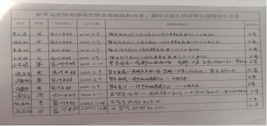 8、我們做了員工排查,建立返崗人員登記制度對返回人員登記,每天微信群詳細記錄職工身體狀況、假期外出情況、與重點疫區(qū)人員接觸情況等信息;對每名員工近14天的去向進行排查;對來自或去過疫情重點地區(qū)的員工建立重點監(jiān)控清單,規(guī)勸其留在當(dāng)?shù)貢翰粡?fù)工,鼓勵員工延遲上班;對來自或去過疫情重點地區(qū)的員工排查其抵達時間,按規(guī)定落實醫(yī)學(xué)觀察、隔離等措施,確保其隔離觀察14天并經(jīng)體溫檢測正常、無不適癥狀后方可上崗。進入崗位工作前自覺接受體溫檢測,體溫正常方可進入工作區(qū),并洗手消毒。嚴(yán)格執(zhí)行各項疫情防控要求,建立和落實復(fù)工上崗前個人防護知識培訓(xùn),多種方式普及傳染病防護知識,做到有癥狀早發(fā)現(xiàn)、早報告、早隔離、早治療。