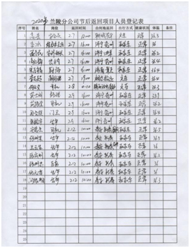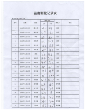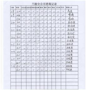配合當?shù)卣w溫監(jiān)測 落實措施,扎實開展防控工作。分公司設立疫情防控點,配備防護口罩、手套、防護鏡、體溫計及測溫槍、酒精、84消毒液、噴霧器等防護物資。嚴格控制返程人員,對居住或經(jīng)過疫情防控重點區(qū)域人員,要求暫不返回項目部,居家隔離自我觀察;要求返回項目部人員,返程路上嚴格落實個人防控措施,制定記錄表,對返回人員嚴格檢查、登記;返回項目部后,在項目部內(nèi)自行隔離14天,每天早晚測量體溫并做好記錄。    返程人員登記 每日體溫監(jiān)測 集中開展項目部衛(wèi)生消毒工作。分公司通過多種渠道,購進酒精、84消毒液等藥品,每天上午下午各進行一次集中消毒工作,辦公室、會議室、廚房、餐廳、宿舍、衛(wèi)生間、走廊、院內(nèi)邊邊角角,全面消殺。  項目部消毒 消毒記錄