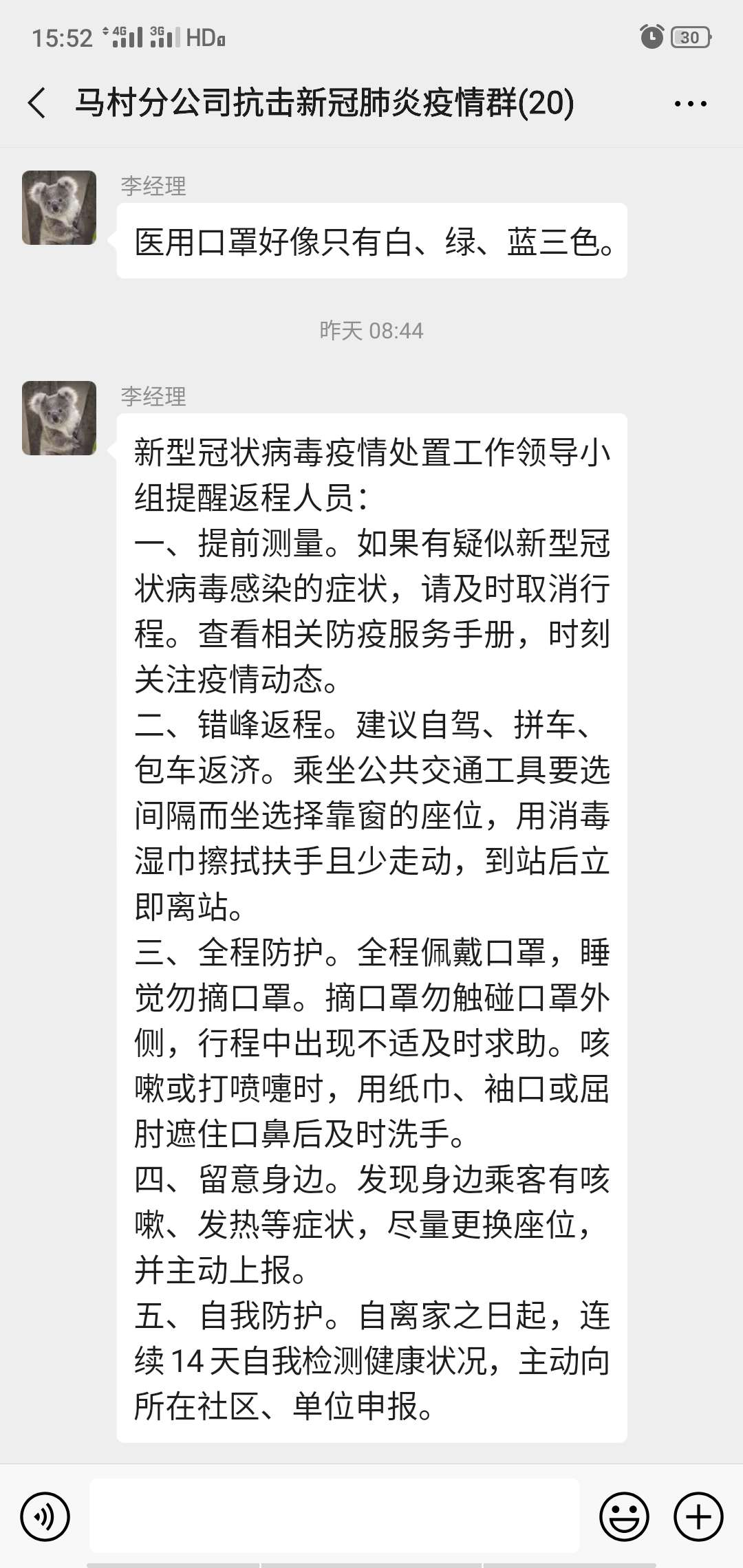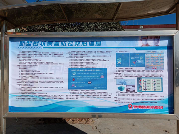 突如其來的災難讓本該舉國同慶的春節(jié)變的人心惶惶。為打好這場保衛(wèi)全國人民的硬仗,2020年1月25日前后,全國30多個省啟動重大突發(fā)公共衛(wèi)生事件一級響應,實行最嚴格的科學防控措施。同時各地方政府也出臺相應的防控的舉措。 為有效控制疫情的傳播,針對疫情期間的各項工作安排,兗州中材馬村分公司于2020年1月29日成立應對疫情工作領導小組。根據省委、省政府及公司關于做好疫情防控的重大決策部署,全面落實分公司的相關工作要求,負責與分公司上級及地方、千業(yè)水泥疫情工作的聯系,協調好疫情期間的人員以及各項工作安排。 假期期間,通過網絡通訊設備進行安全防疫宣傳教育。  通過宣傳欄、條幅等向員工傳達疫情防控知識,提高疫情防控意識。   通過有效途徑采集各類防疫物資,主要包括醫(yī)用酒精、84消毒液、一次性口罩、便攜式噴霧瓶以及測溫儀等。    通過對辦公室、走廊、宿舍以及衛(wèi)生間等公共場所以及公共設備設施進行消毒,早晚各一次。  分公司門口設置崗哨,無關人員禁止出入;對相關人員進行信息登記,對進出人員進行測體溫并登記,無異常才允許進入,如發(fā)現異常及時上報處理。  公司員工每天測量體溫,匯報身體狀況;對于外地返崗人員,按照相關規(guī)定進行相應的隔離,隔離期間每天3次匯報體溫,并接受地方政府及先關人員的監(jiān)督,確保萬無一失。