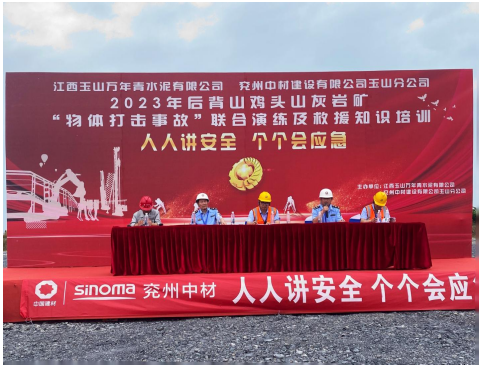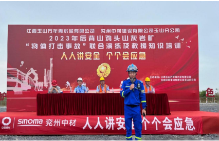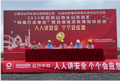 為深入宣貫黨的二十大精神和習(xí)近平總書記關(guān)于安全生產(chǎn)重要論述,進一步樹牢“以人為本、安全發(fā)展”的安全生產(chǎn)管理理念,貫徹“安全第一、預(yù)防為主、綜合治理”的安全生產(chǎn)方針,強化非煤礦山事故應(yīng)急救援管理工作和應(yīng)急救援隊伍建設(shè),切實提高分公司應(yīng)對礦山突發(fā)事故的聯(lián)合應(yīng)急救援綜合能力,6月17日,兗州中材玉山分公司聯(lián)合江西玉山萬年青水泥有限公司、玉山縣藍天救援隊、玉山縣人民醫(yī)院等舉辦2023年“物體打擊事故”聯(lián)合演練及救援知識培訓(xùn)活動。玉山縣應(yīng)急管理局局長吳高峰、玉山萬年青水泥有限公司總經(jīng)理李躍華等出席本次活動并致辭。