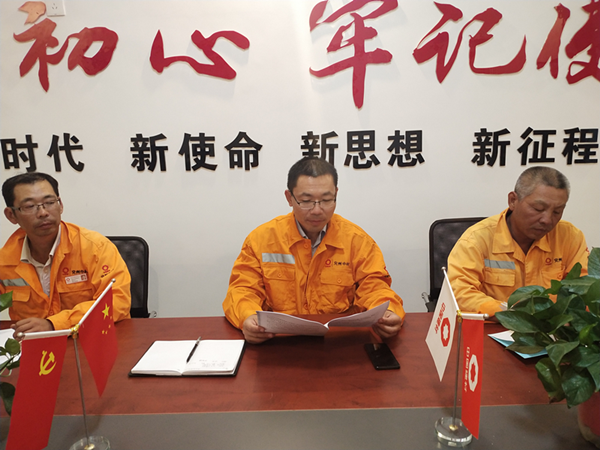 按上級(jí)黨委統(tǒng)一部署,寧陽(yáng)項(xiàng)目部于9月23日晚召開(kāi)全體員工結(jié)合中材礦山劉書(shū)記講話精神,開(kāi)展“不忘初心,牢記使命”主題教育活動(dòng)。 會(huì)上,劉經(jīng)理首先帶領(lǐng)全體員工認(rèn)真學(xué)習(xí)《在中材礦山建設(shè)有限公司開(kāi)展“不忘初心,牢記使命”主題教育部署會(huì)上的講話》。全體員工分別針對(duì)“不忘初心,牢記使命”主題教育活動(dòng)展開(kāi)發(fā)言討論。最后,根據(jù)《在中材礦山建設(shè)有限公司開(kāi)展“不忘初心,牢記使命”主題教育部署會(huì)上的講話》會(huì)議精神,劉經(jīng)理呼吁全體員工要積極努力地向黨靠攏,今后更加緊密團(tuán)結(jié)在以習(xí)近平同志為核心的黨中央周圍,高舉習(xí)近平新時(shí)代中國(guó)特色社會(huì)主義思想偉大旗幟,扎實(shí)做好“不忘初心,牢記使命”主題教育工作,為全面完成集團(tuán)和股份公司下達(dá)的各項(xiàng)經(jīng)濟(jì)指標(biāo)而努力奮斗,以優(yōu)異的成績(jī)迎接新中國(guó)成立70周年   |