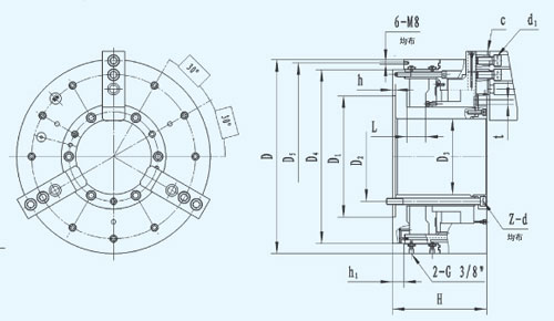 ☆前置式氣動(dòng)夾緊,卡盤內(nèi)藏氣缸,機(jī)床前后可各配一臺(tái)卡盤。