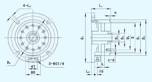 注:可根據(jù)用戶要求,設(shè)計(jì)與K51、K54等系列動(dòng)力卡盤(pán)配套的立式固定油缸。
