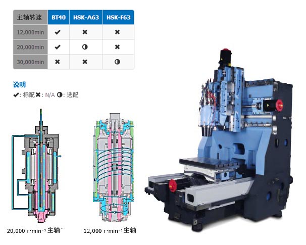 12,000轉(zhuǎn)主軸以前端四個角接觸混合軸承為支撐,提供了主軸強大的剛性和卓越的重切削能力。配以夾套冷卻,主軸的熱伸長通過一個2600kcal/h的散熱器可得到很好的控制,散熱器的流速為25L/min,可帶走主軸軸承上的熱量。